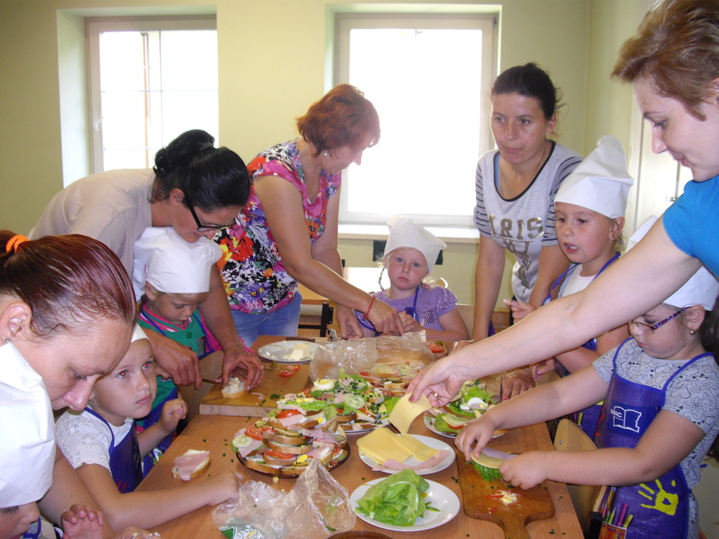 -Wspólne przygotowanie kolorowych kanapek : zgromadzenie produktówi narzędzi. Rozmowa na temat higieny i bezpieczeństwa podczas pracy. Ozdabianie kanapek wg pomysłów dzieci z wykorzystaniem dowolnych produktów spożywczych - dziewczynki z mamami.