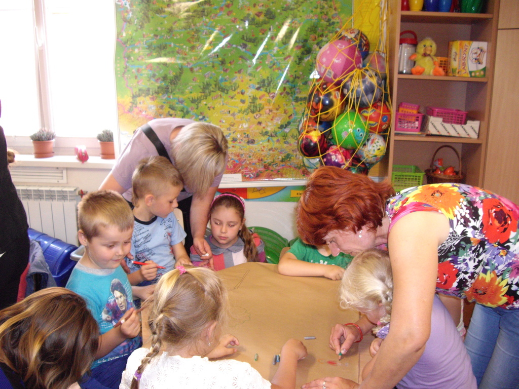 Zaproszenie do wspólnej zabawy grupy 3/4 latków.Dzieci z mamami pracowały w dwóch grupach.