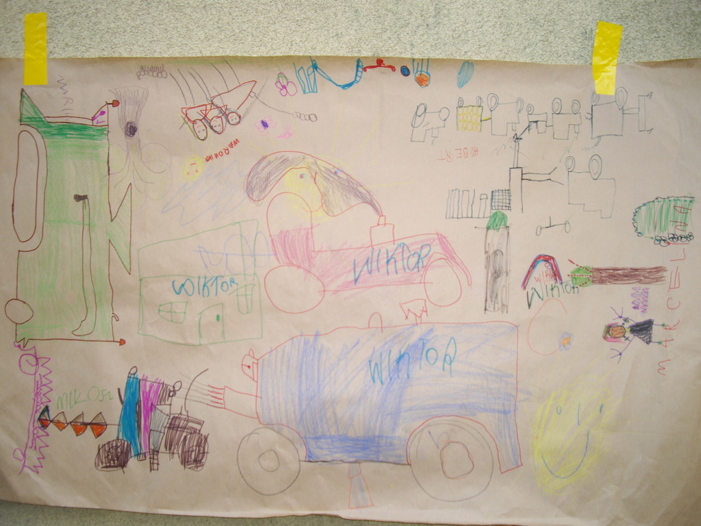 -Dekoracja placu zabaw wg pomysłu dzieci przy użyciu różnorodnych materiałów plastycznych - chłopcy z mamami.