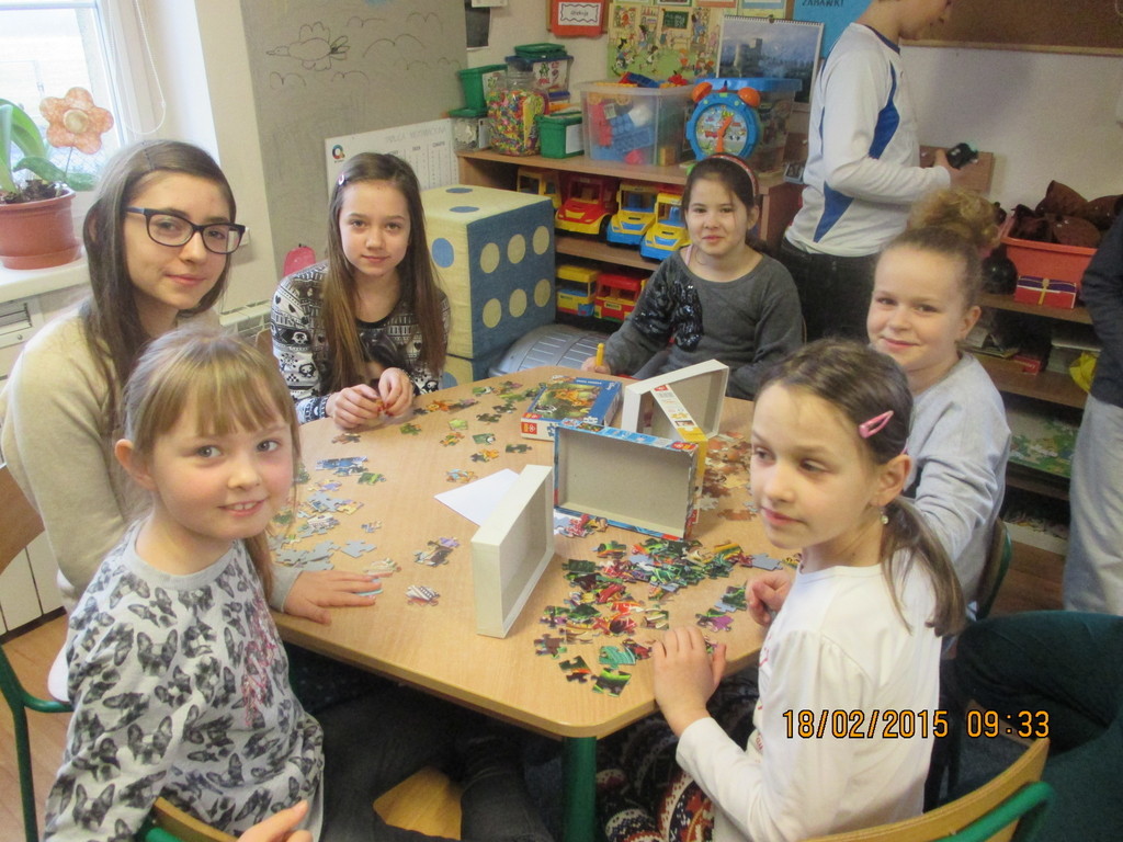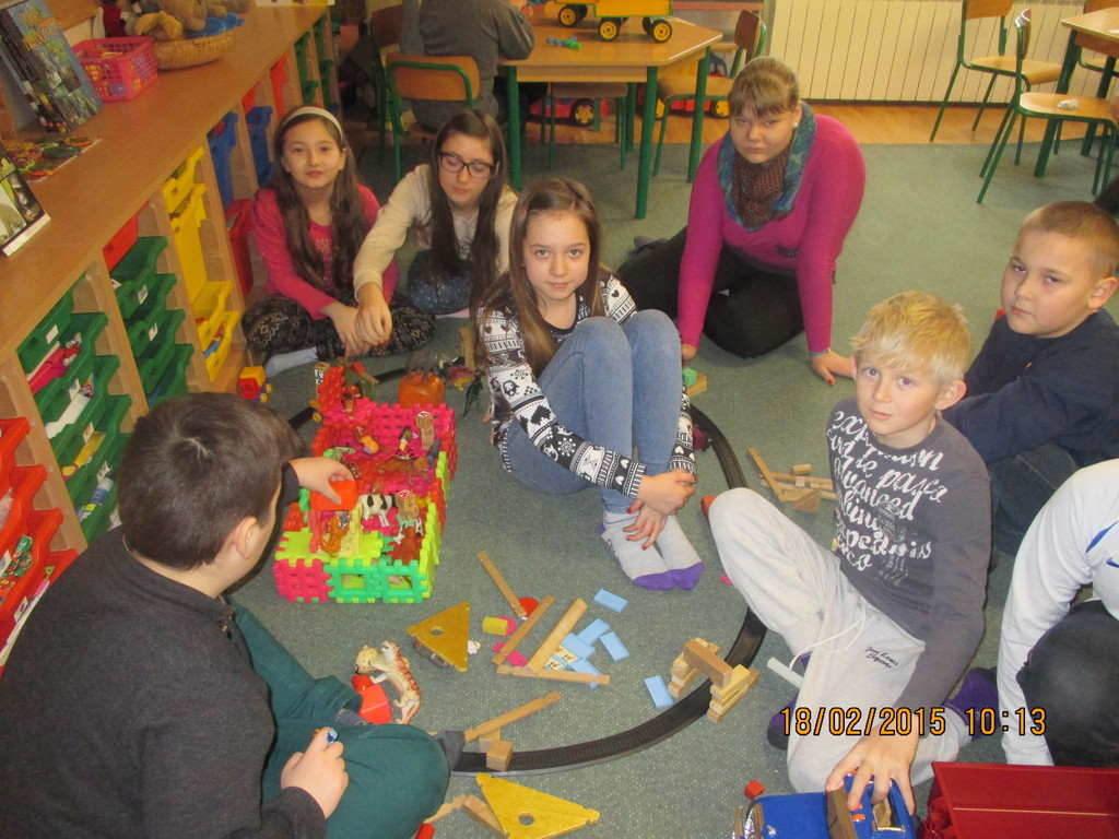 ,,Stary niedźwiedź mocno śpi...", ,,Chodzi lisek koło drogi..." - takie zabawy miały miejsce w czasie ferii w naszym przedszkolu. Czy to przedszkolaki tak się bawiły? Otóż nie! W salach przedszkolnych zagościli uczniowie szkoły! Bawili się w dom, gotowanie, układali puzzle, budowali tory kolejowe... Zobaczcie na zdjęciach, jak świetnie spędzili czas.
