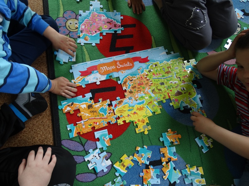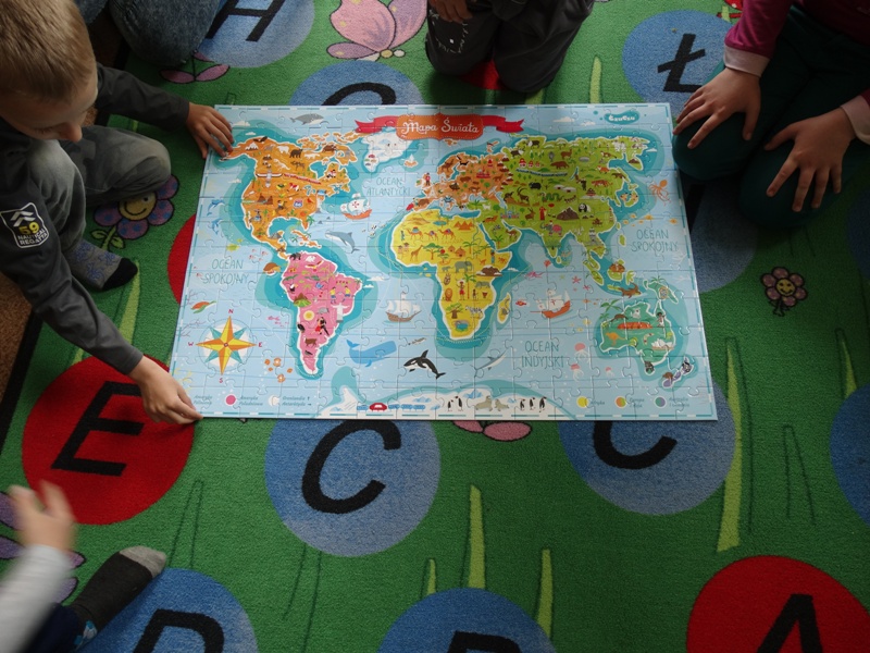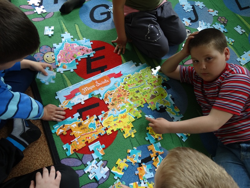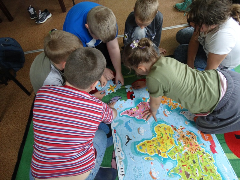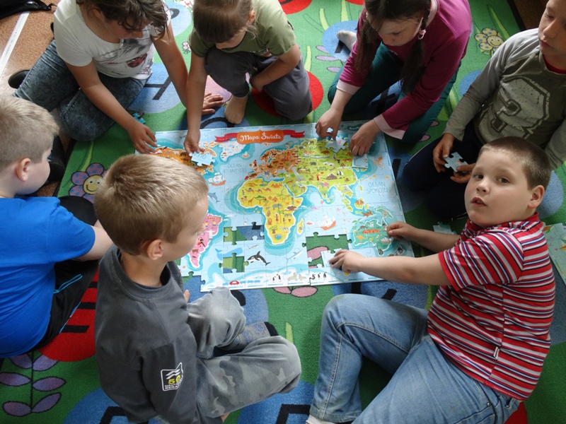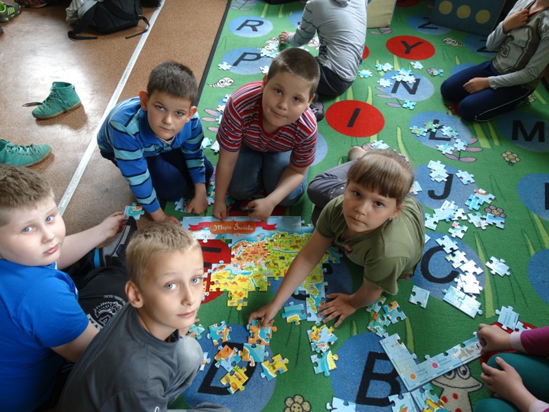 Podstawowym celem działalności świetlicy jest zapewnienie uczniom opieki po zajęciach lekcyjnych, dlatego też nasi nauczyciele dbają o to by w tym czasie stworzyć dzieciom warunki do odpoczynku, jak również do rozwijania ich zainteresowań. Wczoraj np. nasze dzieci układały puzzle, które po ułożeniu zamieniły się w mapę świata :)