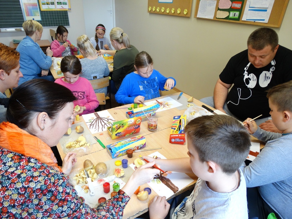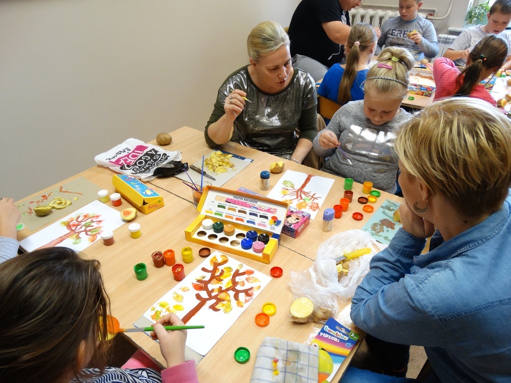 Dzisiaj w klasie III odbyła się lekcja plastyczna, w której uczestniczyli również rodzice naszych uczniów. Dzieci wraz z opiekunami wykonali prace za pomocą użycia stempelków z ziemniaków. Serdecznie dziękujemy rodzicom za chęć i udział w lekcji:)