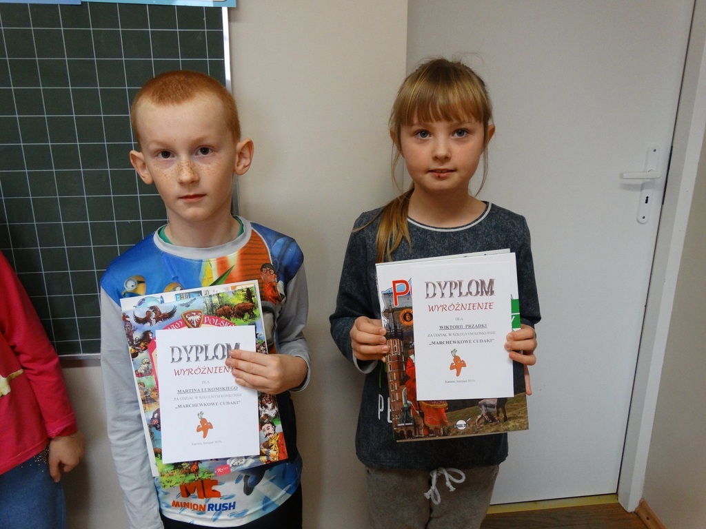 W zeszłym tygodniu w naszej szkole odbył się konkurs pt. "MARCHEWKOWE CUDAKI", którego organizatorką była pani Jolanta Kruszyk. Udział w konkursie wzieli uczniowie klasy I oraz III. Celem konkursu było przygotowanie przez dzieci postaci z marchewki. Wyróżnienia zdobyli: Martin Łukomski oraz Wiktoria Prządka. Gratulujemy