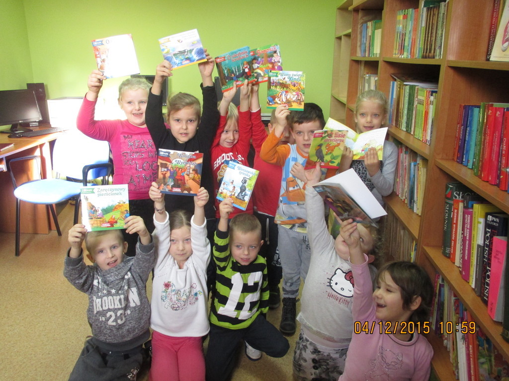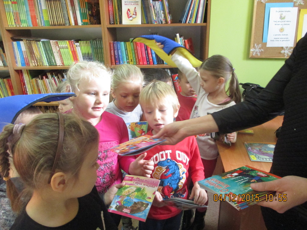 W piątek 4 grudnia bibliotekę szkolną odwiedziły przedszkolaki z "zerówki". Dzieci obejrzały nowe książki zakupione w ramach programu rządowego "Książki naszych marzeń", słuchały głośnego czytania, a na koniec otrzymały prezenty - kolorowe książeczki.