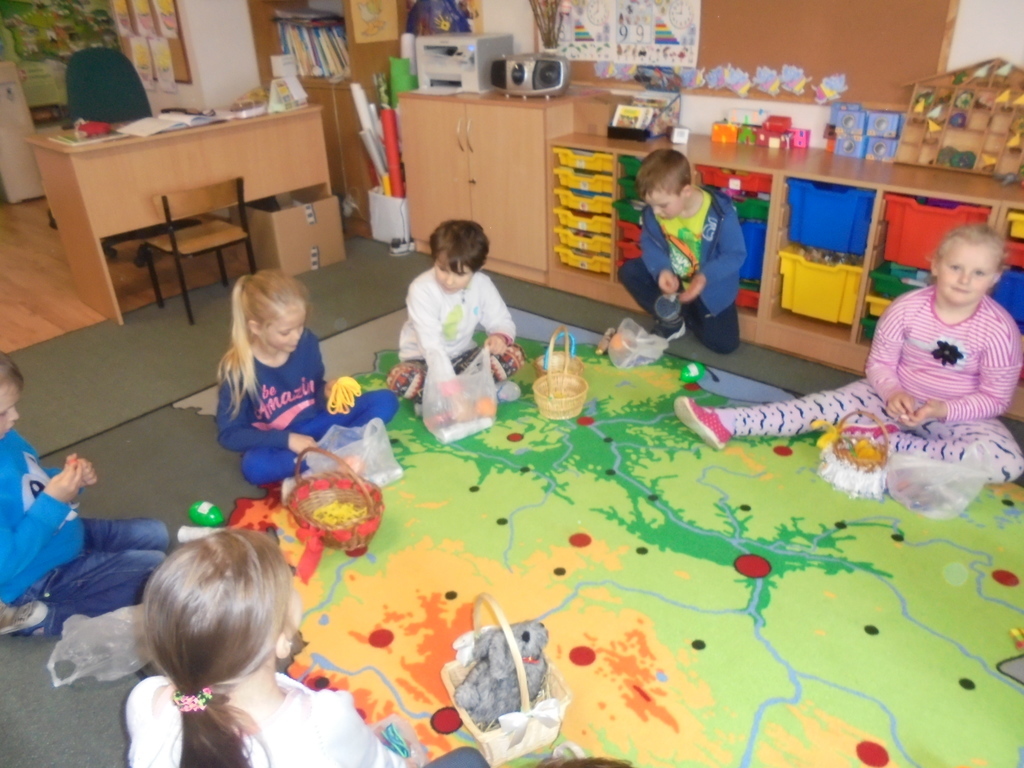 Zajączek wielkanocny nie zapomniał o naszych przedszkolakach Dzisiaj na dzieci czekały słodkie upominki, które zajączek zostawił dla nich w specjalnie przygotowanych wielkanocnych koszyczkach.
