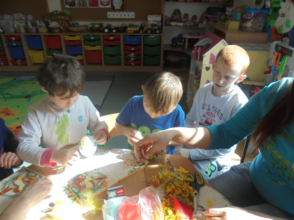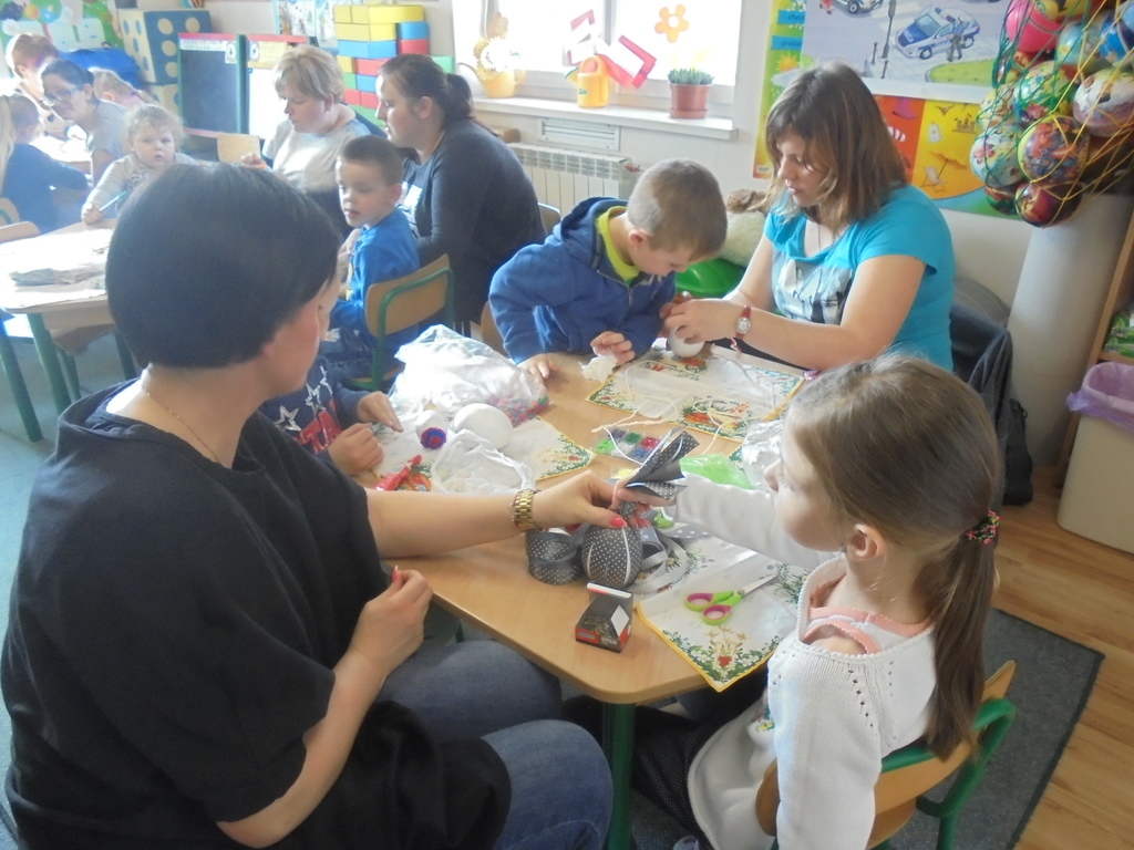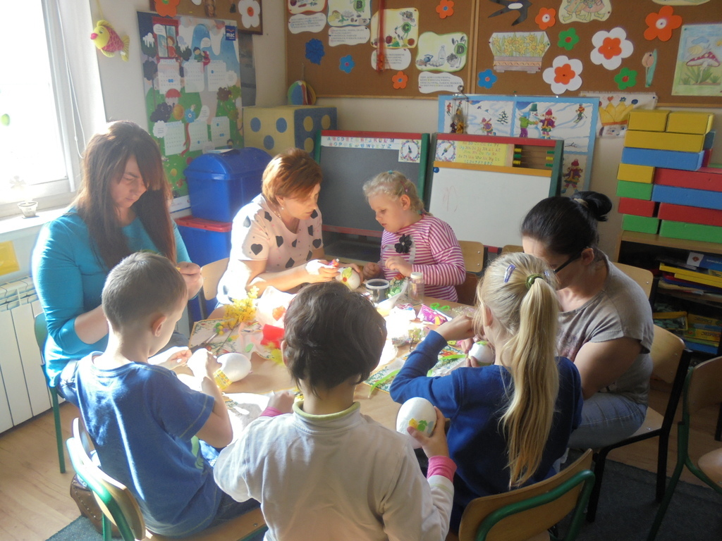 W naszym przedszkolu, a dokładnie w kl. 0, dzisiaj- czyli tuż przed świętami Wielkanocnymi, odbyły się zajęcia otwarte z udziałem dzieci i ich rodziców. Miały one na celu przybliżenie dzieciom tradycji Świąt Wielkanocnych, a w szczególności obyczaju malowania pisanek, bez których nie wyobrażamy sobie Wielkanocy! Po krótkiej prezentacji, której dokonała pani Danuta Wróbel, dzieci wspólnie ze swoimi najbliższymi malowały i oklejały swoje własne pisanki. Na pewno będą one piękną ozdobą w ich koszyczkach i na stołach wielkanocnych, gdyż okazały się one prawdziwymi dziełami sztuki.