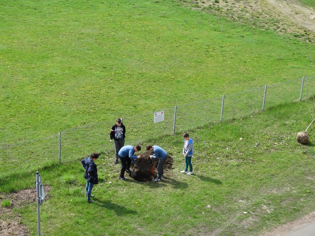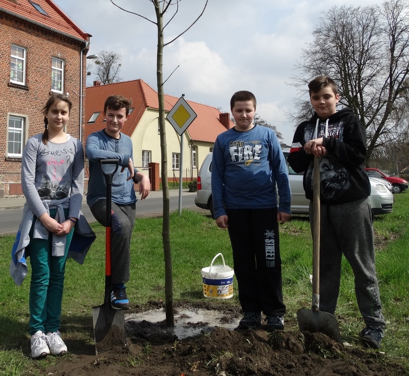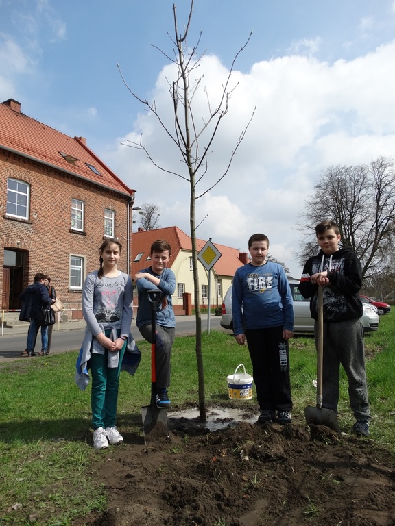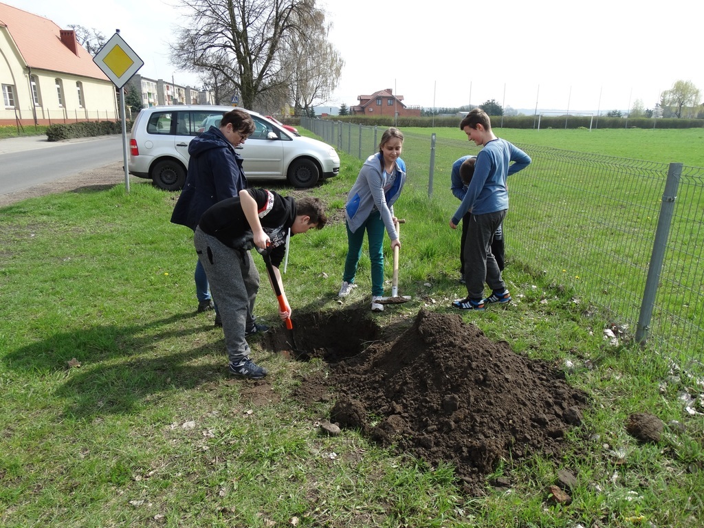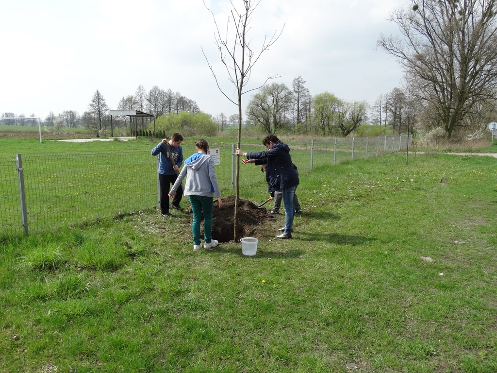 15.04.2016r. zgodnie z obyczajem naszej szkoły, klasa VI posadziła drzewo- klon pospilty. Jest to pamiatka, która już zawsze będzie przypominać wszystkim o ich obecności w naszej placówce. Uczniom w posadzeniu drzewa pomagała wychowawczyni- pani Beata Matyjasik.