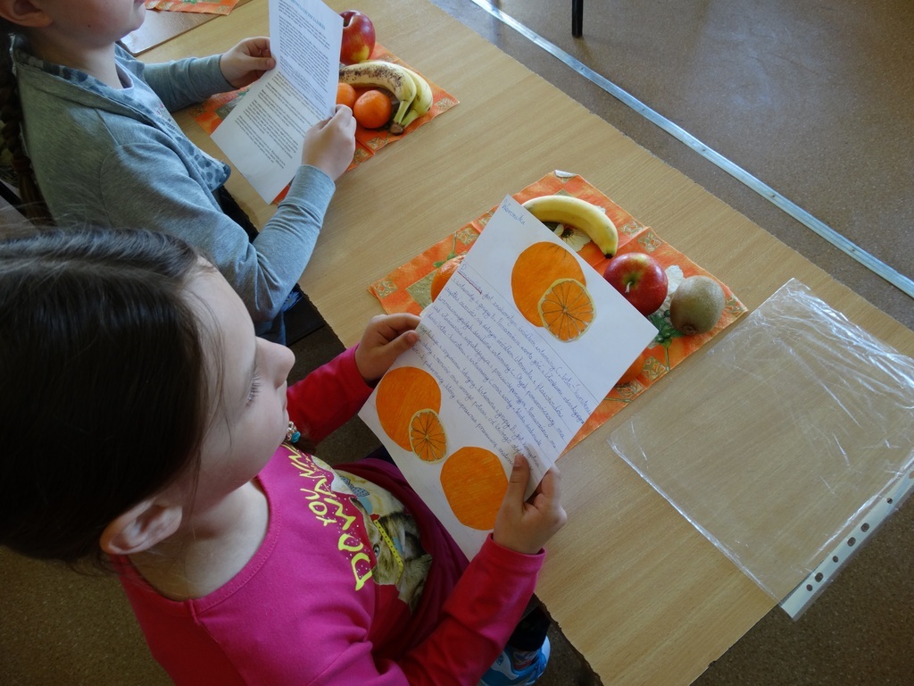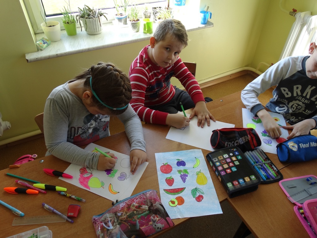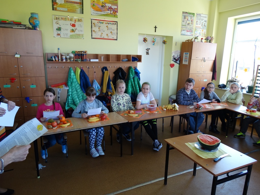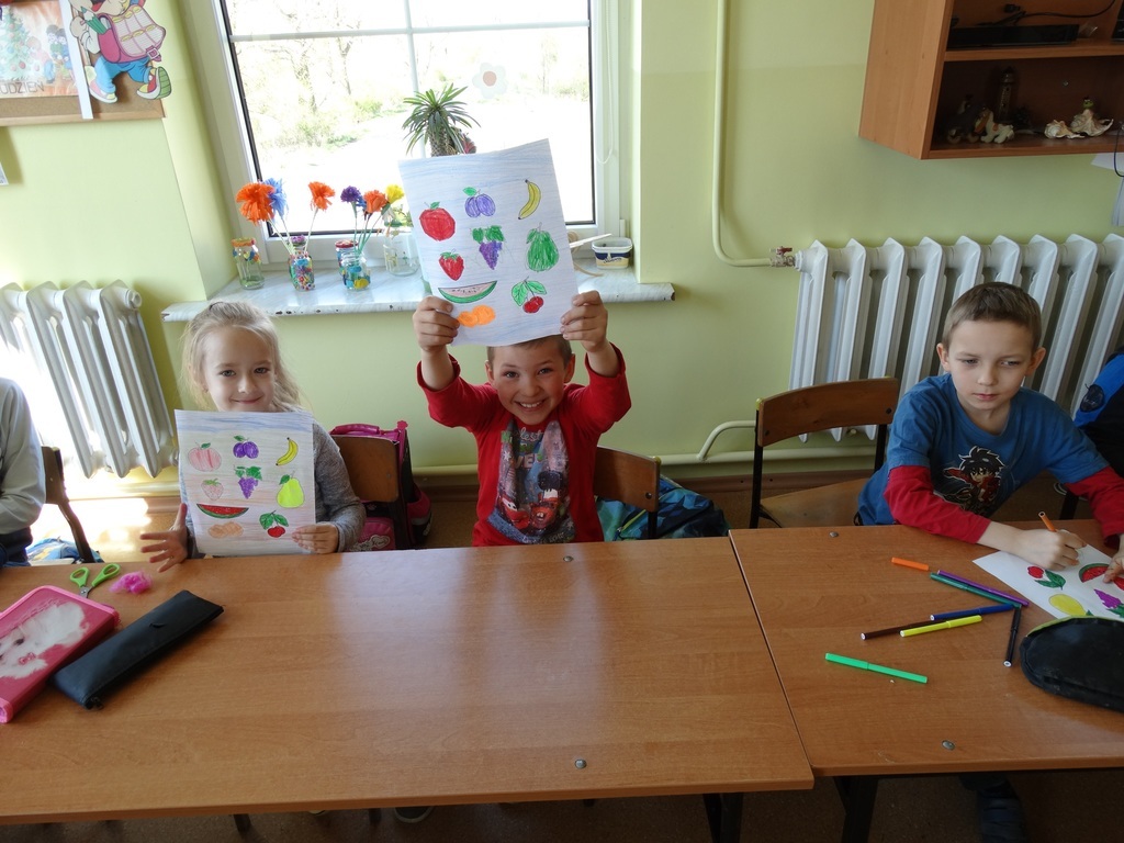 Na dzisiejszych zajęciach dzieci wraz z wychowawczyniami wspólnie omówiły wartości odżywcze poszczególnych owoców, a także ich dobroczynny wpływ na nasze zdrowie. Niespodzianką lekcji była owocowa uczta oraz wykonanie przez dzieci pięknych kolorowych rysunków. Miejmy nadzieję, że owoce na stałe zagoszczą w codziennej diecie naszych uczniów, gdyż wszyscy uczniowie doszli do wniosku, że owoce są źródłem niezbędnych witamin, gaszą pragnienie i wyśmienicie sycą.