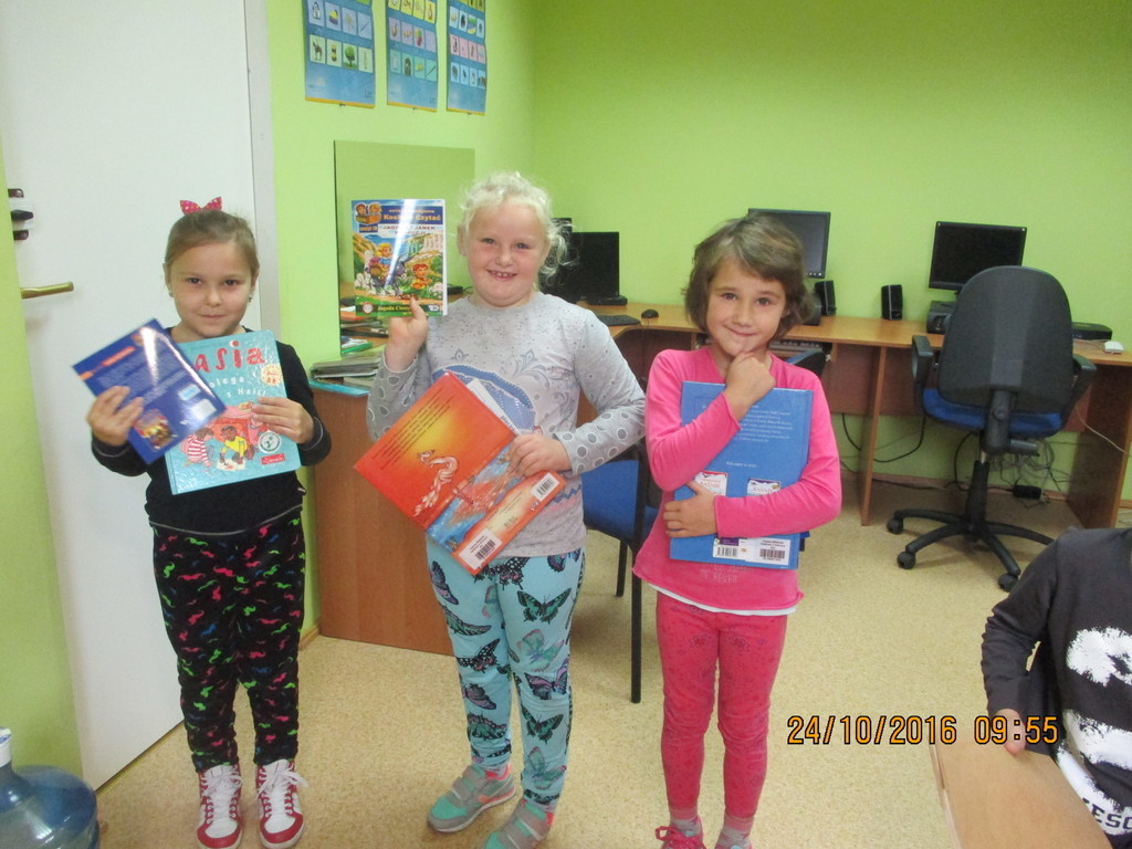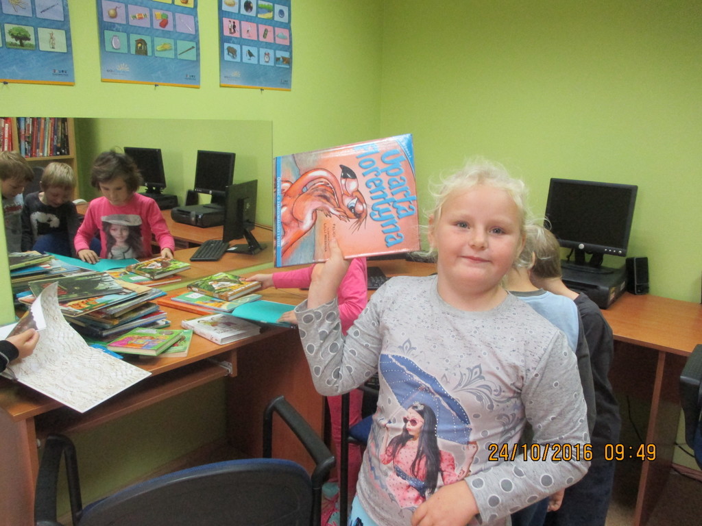 W poniedziałek pierwszaki odwiedziły szkolną bibliotekę. Nie była to ich pierwsza wizyta, ponieważ już w przedszkolu często tam gościły. Wszyscy uczniowie mają już założone karty czytelnika i chętnie wypożyczają książki, aby czytać je razem z rodzicami. W bibliotece dzieci posłuchały "Wesołych bajek" Agnieszki Frączek, a na koniec otrzymały w prezencie kolorowe książeczki.