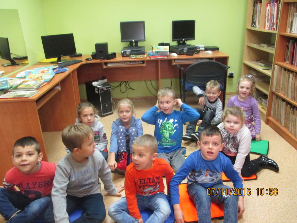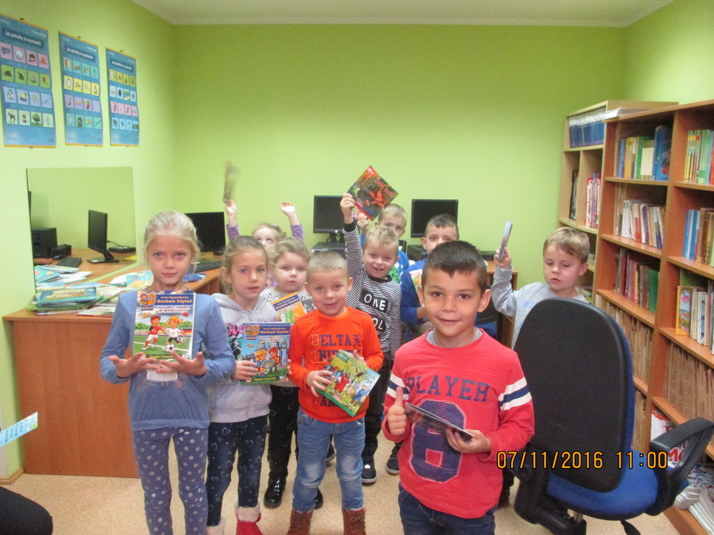 Odwiedziny przedszkolaków w bibliotece szkolnej to już nasza tradycja. W poniedziałek odbyła się lekcja biblioteczna dla grupy starszaków, podczas której dzieci obejrzały księgozbiór, posłuchały bajek i otrzymały w prezencie kolorowe książeczki.