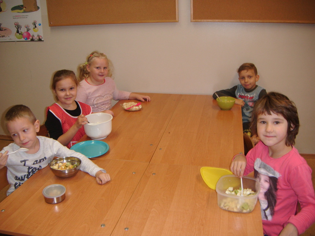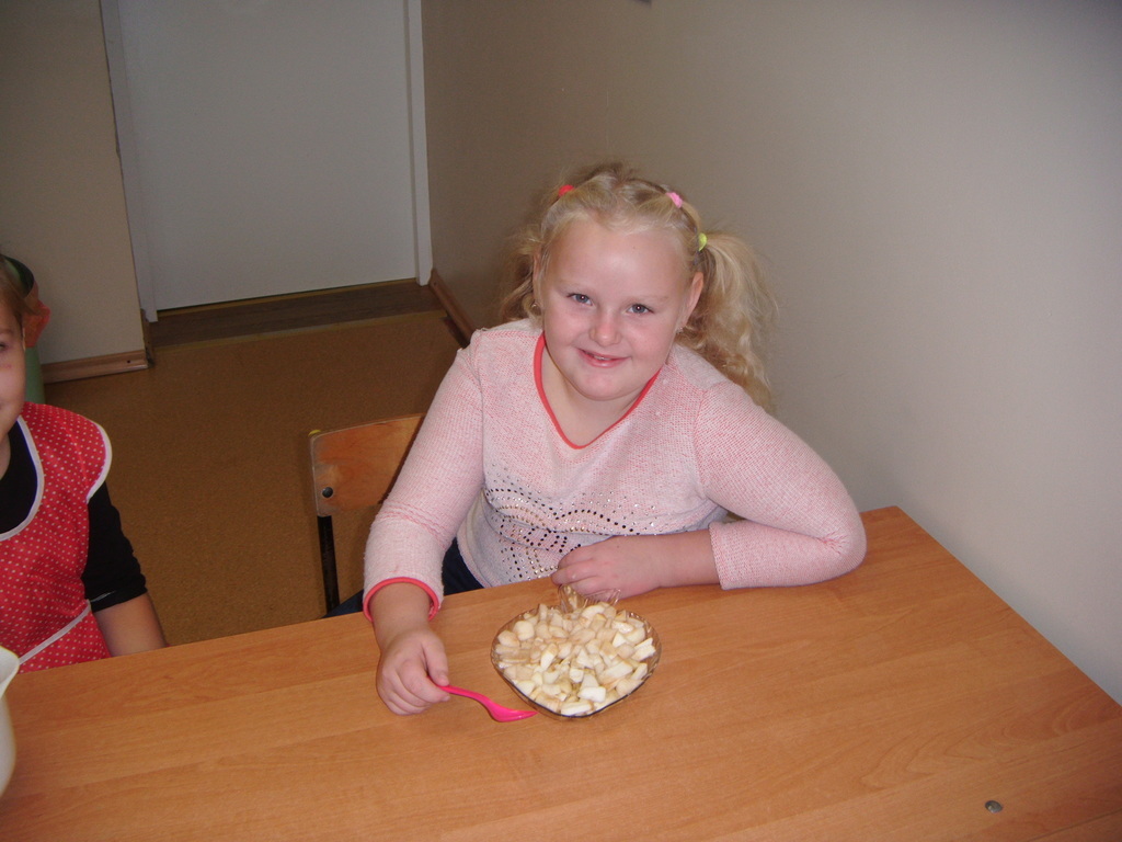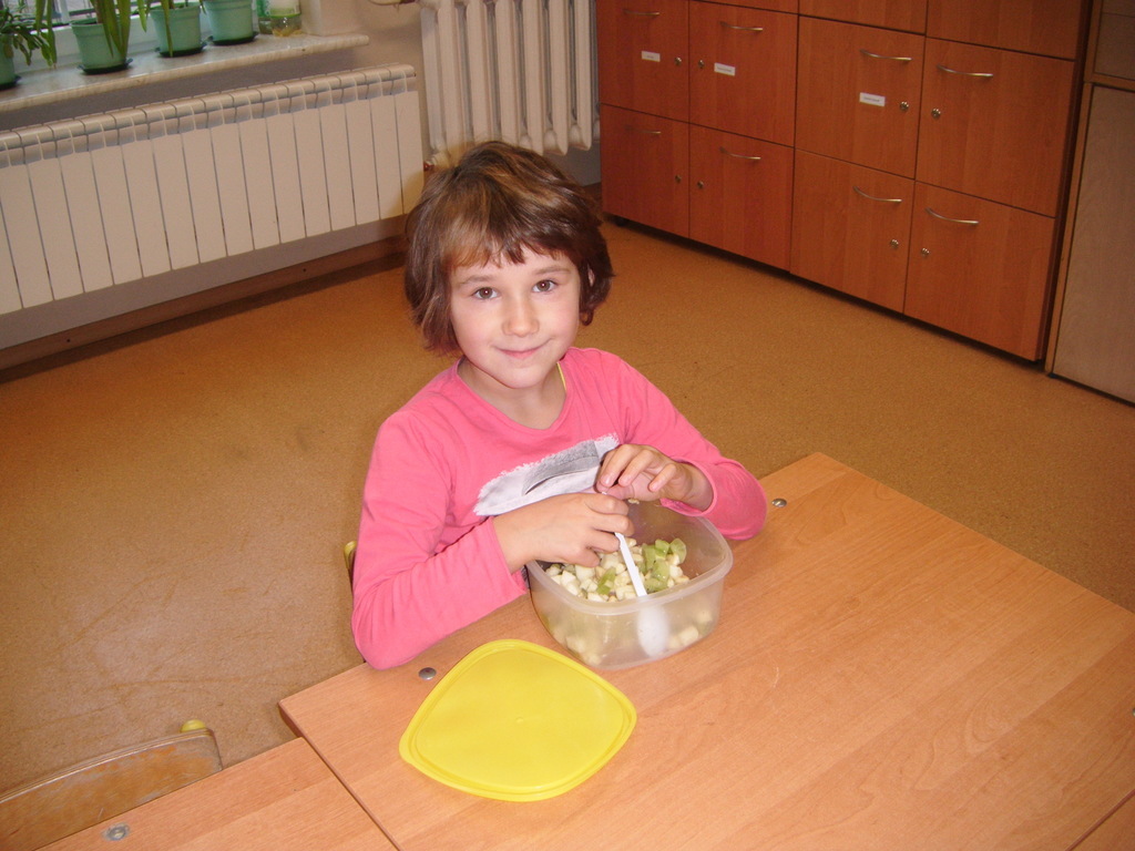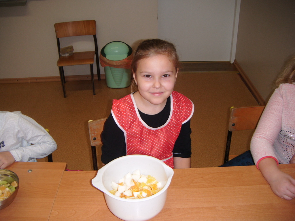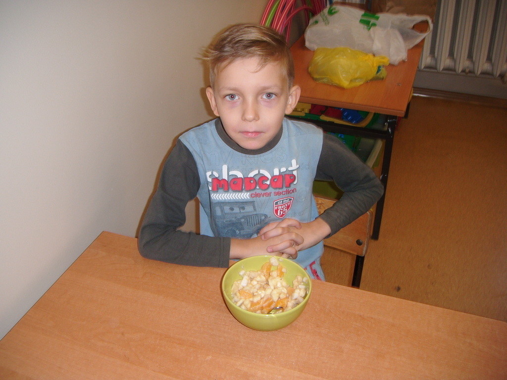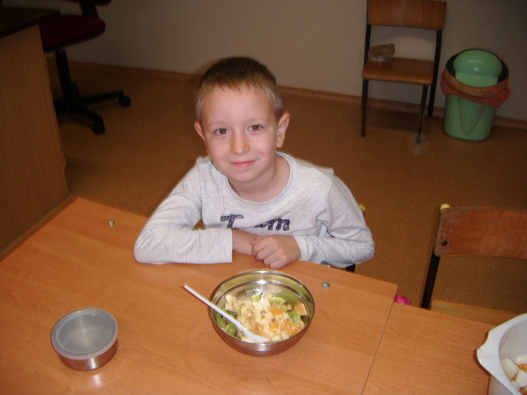 Uczniowie z klasy 1 na chwilę zamienili swoją salę w kuchnię i przyrządzali sałatkę owocową. Z wielkim zapałem wszyscy obierali, kroili i doprawiali swoje smaczne danie wykazując się przy tym dużą cierpliwością i zaangażowaniem. Owocowa sałatka zachęciła uczniów do zdrowego odżywiania i sprawiła wiele radości, a jak smakowała…