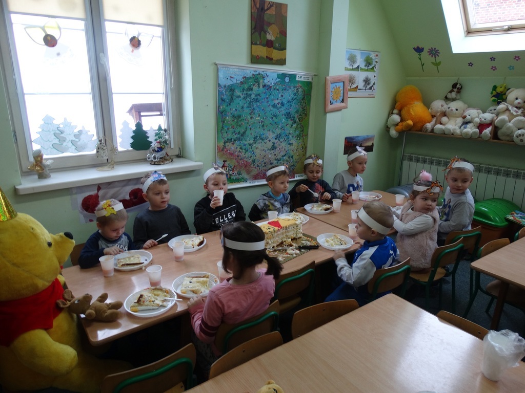 Jak co roku, z okazji urodzin Kubusia Puchatka, nasze przedszkole zamieniło się w Stumilowy Las, a dzieci- w jego mieszkańców. Były wspólne zabawy, zagadki, tańce i oczywiście miodowy tort