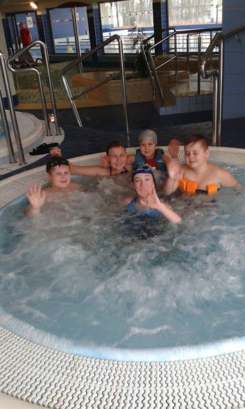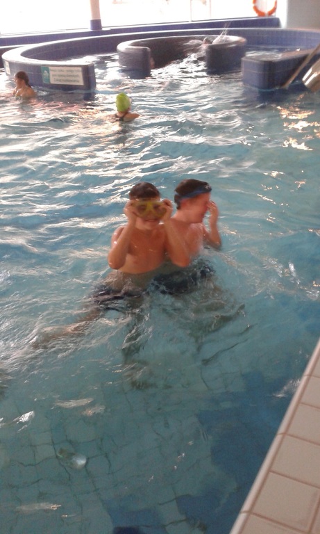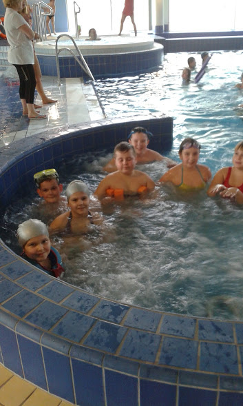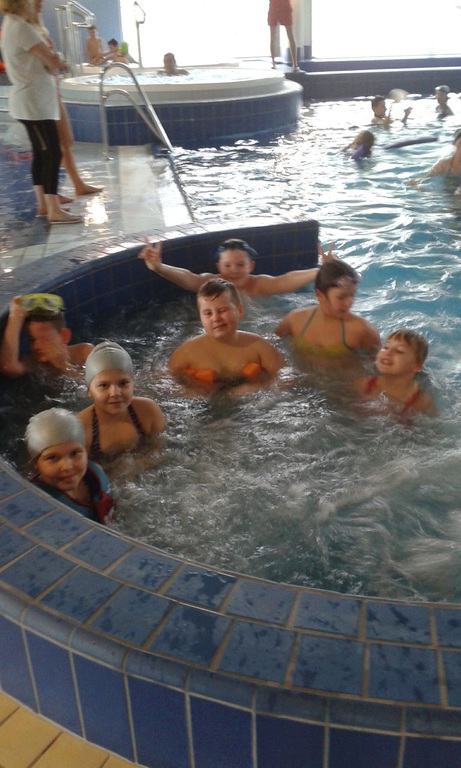 W czasie ferii zimowych staramy się, aby dzieci, które nie wyjeżdżają nigdzie na ferie, mogły również spędzić atrakcyjnie wolny czas- w zeszłym tygodniu nasi uczniowie wraz z panią Janiną Krzymińską wybrali się na basen do Parku Wodnego "Planty" w Pleszewie