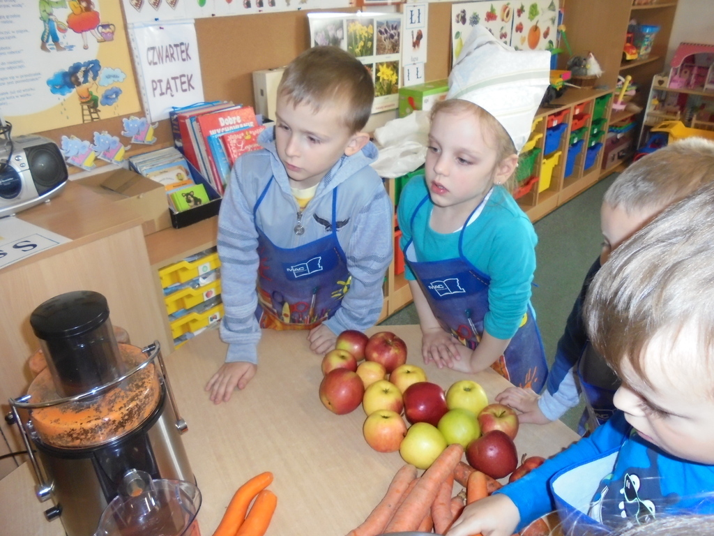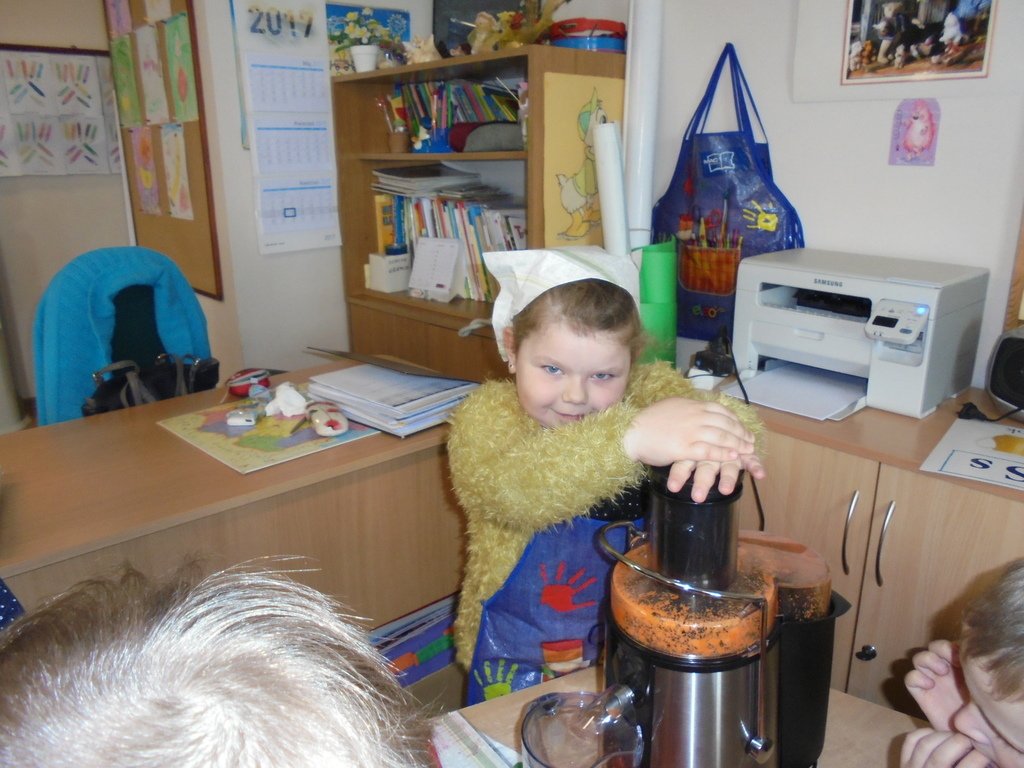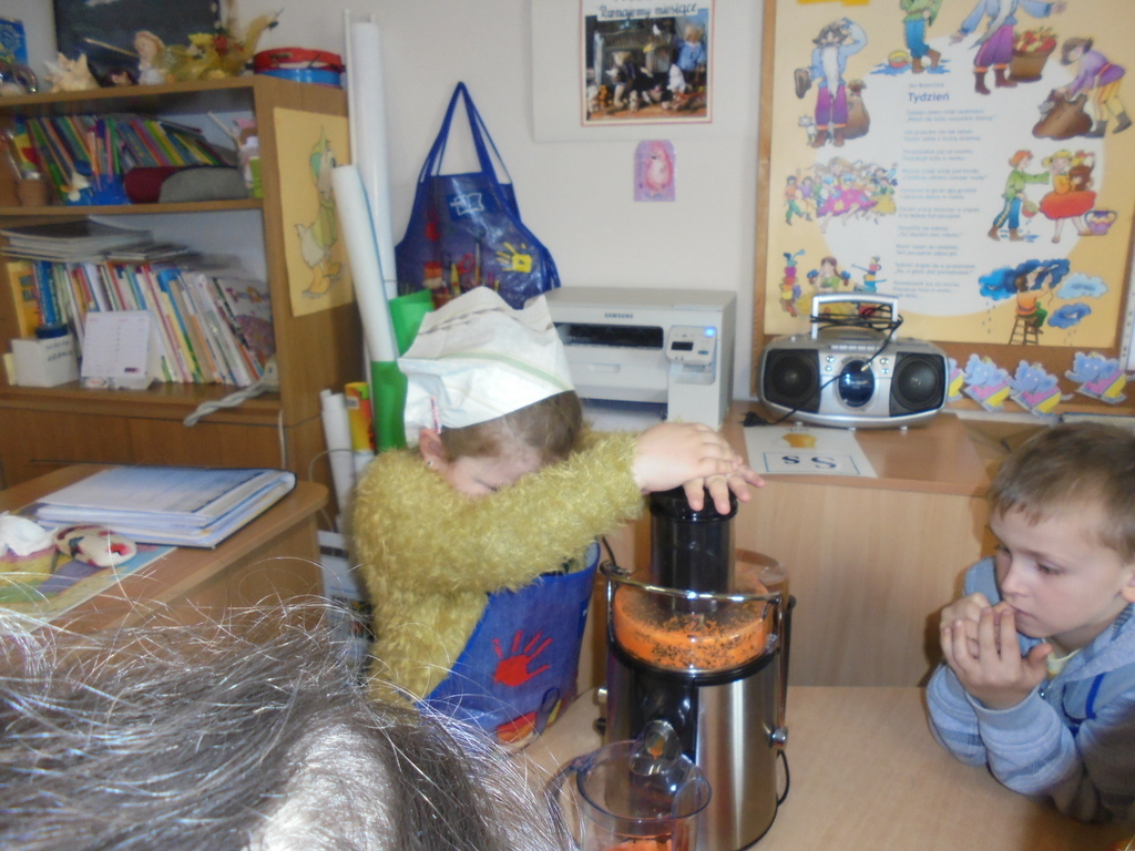Kształtowanie postaw prozdrowotnych jest procesem długotrwałym i zaczyna się już od najmłodszych lat. Dlatego też mając na uwadze zdrowie naszych wychowanków nie zapominamy o organizowaniu sytuacji edukacyjnych, które promują zdrowie. Dzieci z gr. 0 wraz ze swoja wychowawczynią panią Danutą Wróbel, przygotowywały dzisiaj przepyszne soki. Soki owocowe i warzywne stają się bowiem coraz bardziej popularne i to nie tylko ze względu na swoje walory odżywcze i smakowe, lecz także ze względu na swoje właściwości lecznicze, profilaktyczne i odmładzające.