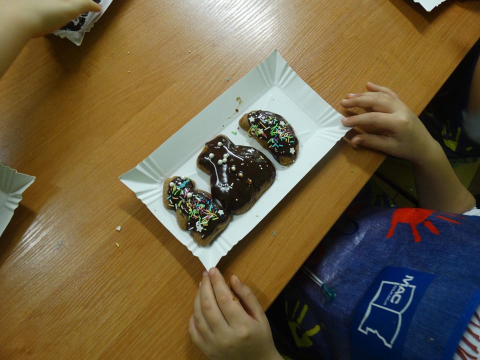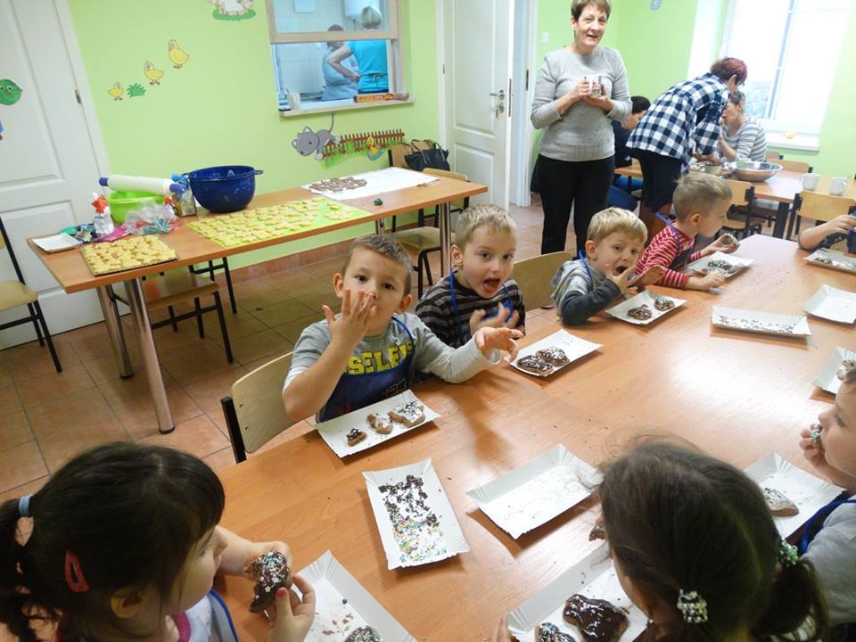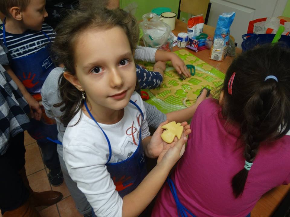 5 grudnia, dla dzieci z grupy "0", był bardzo pracowity, bowiem tego dnia piekły one wraz z mamami i swoją wychowawczynią panią Danutą Wróbel-pierniczki. Najpierw odpowiednio się przygotowały dbając o czyste rączki oraz zakładając fartuszki. Poznały też składniki i sposób wykonania ciasta, potrzebne przybory kuchenne a także zasady bezpieczeństwa. Gdy wszystko było gotowe przedszkolaki z ogromnym zapałem i zaangażowaniem zabrały się do pracy – wałkowały ciasto, wykrawały ciasteczka. Efektem ich pracy były pełne blaszki pierniczków, które zanieśliśmy do kuchni, gdzie pod czujnym okiem naszych pań kuchareczek pierniki nabierały koloru piekąc się w piekarniku.