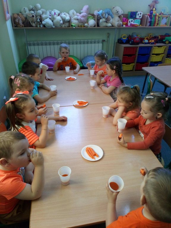 Dzieci z Przedszkola z grupy KRASNOLUDKI obchodziły wczoraj Dzień Marchewki. Celem zajęć było zwrócenie uwagi na walory odżywcze i smakowe warzyw, a zwłaszcza marchewki oraz kształtowanie nawyku spożywania warzyw w różnej postaci.Tego dnia w przedszkolu dominował kolor zielony i pomarańczowy.Przy piosenkach najmłodsi rozwijali swoje talenty taneczne oraz muzyczne. Po tańcach i zabawach nastąpiło dekorowanie prawdziwej marchewki oraz degustacja soku z marchwi i chrupanie surowej marchewki.Po takiej dawce witamin, śmiechu i zabawy na pewno wszystkie przedszkolaki będą zdrowe, piękne i uśmiechnięte