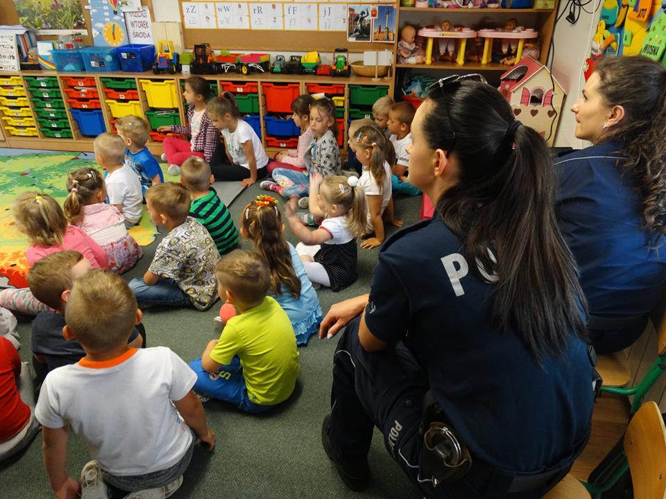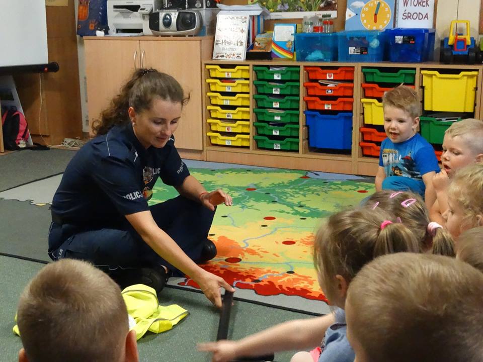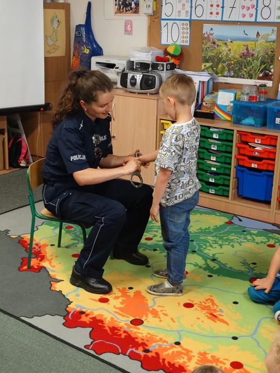 Dzisiaj, 23.05.2018, do przedszkola przyjechały Panie policjantki. W ramach programu „Bezpiecznie to wiedzieć i znać” mł.asp. Monika Lis-Rybarczyk, profilaktyk KPP Pleszew wspólnie z dzielnicową, mł. asp. Karoliną Biesicką rozmawiały z dziećmi o bezpieczeństwie na drodze, zachowaniu wobec nieznajomych, którzy ich zaczepiają, bezpiecznym zachowaniu w domu, podczas nieobecności rodziców i opiekunów. Dzieci przypomniały sobie także numery alarmowe. Na koniec niektórzy dali się zakuć w kajdanki. Atrakcją była możliwość zajęcia miejsca kierowcy radiowozu policyjnego. Spotkanie odbyło się w miłej atmosferze a każde dziecko otrzymało lizaka.