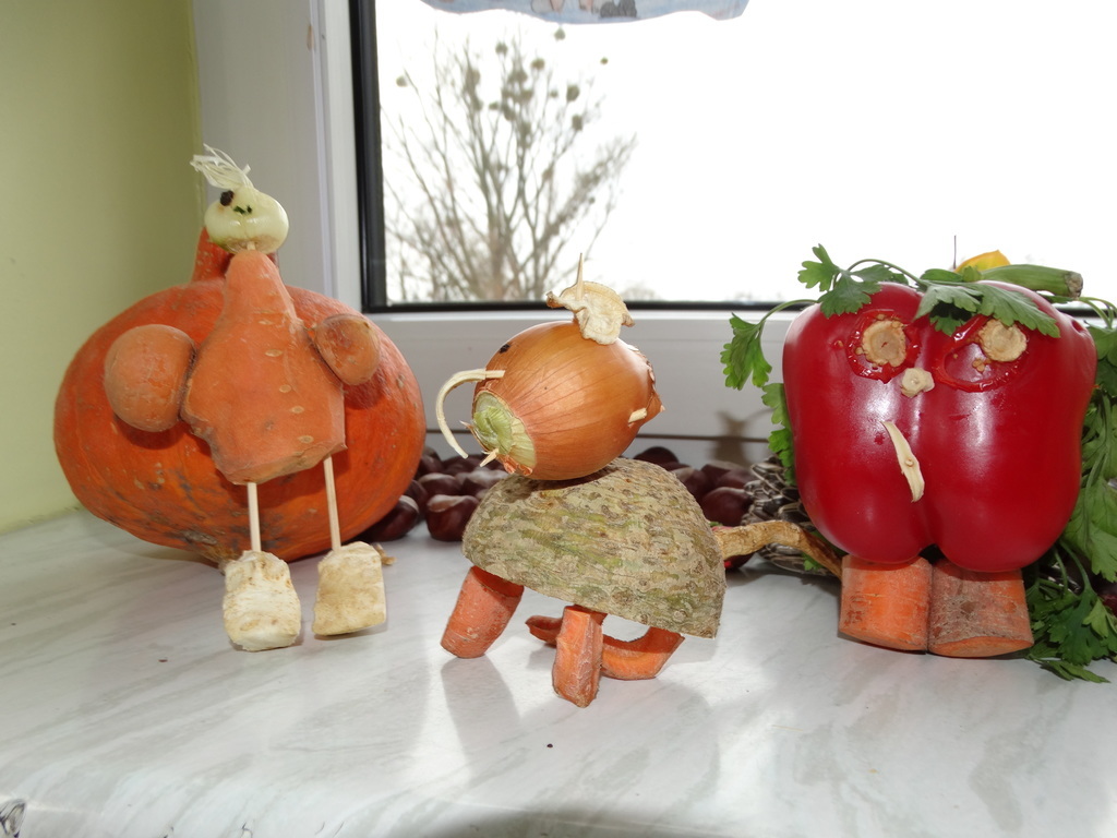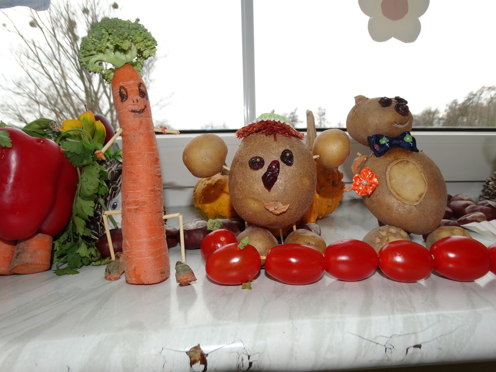 Na parapecie pierwszej klasy zagościły zwierzęta i stworki wykonane z warzyw. Sami oceńcie sposób wykonania. Nam podobają się bardzo.