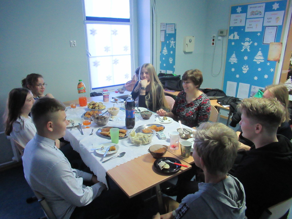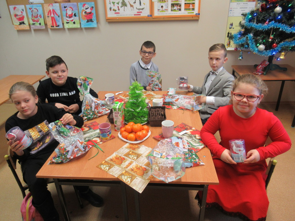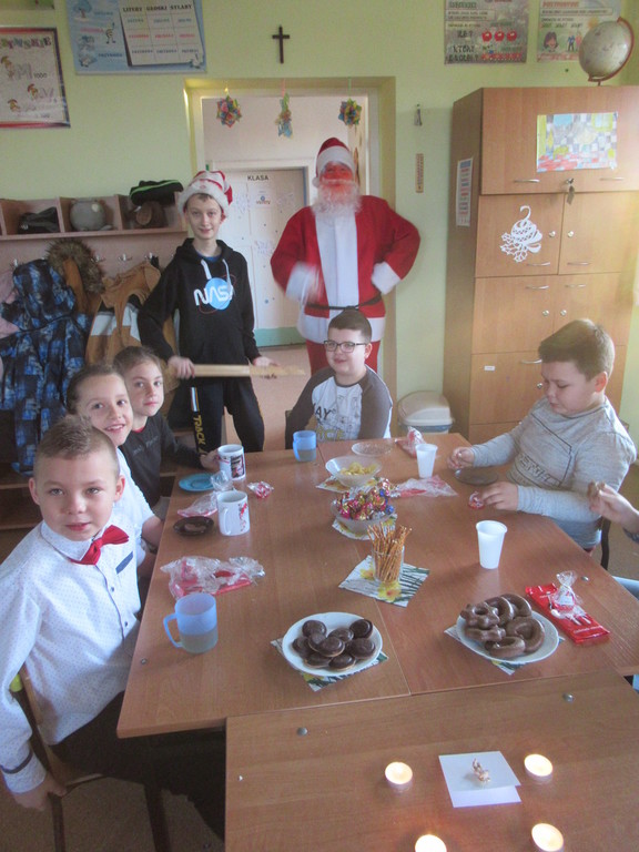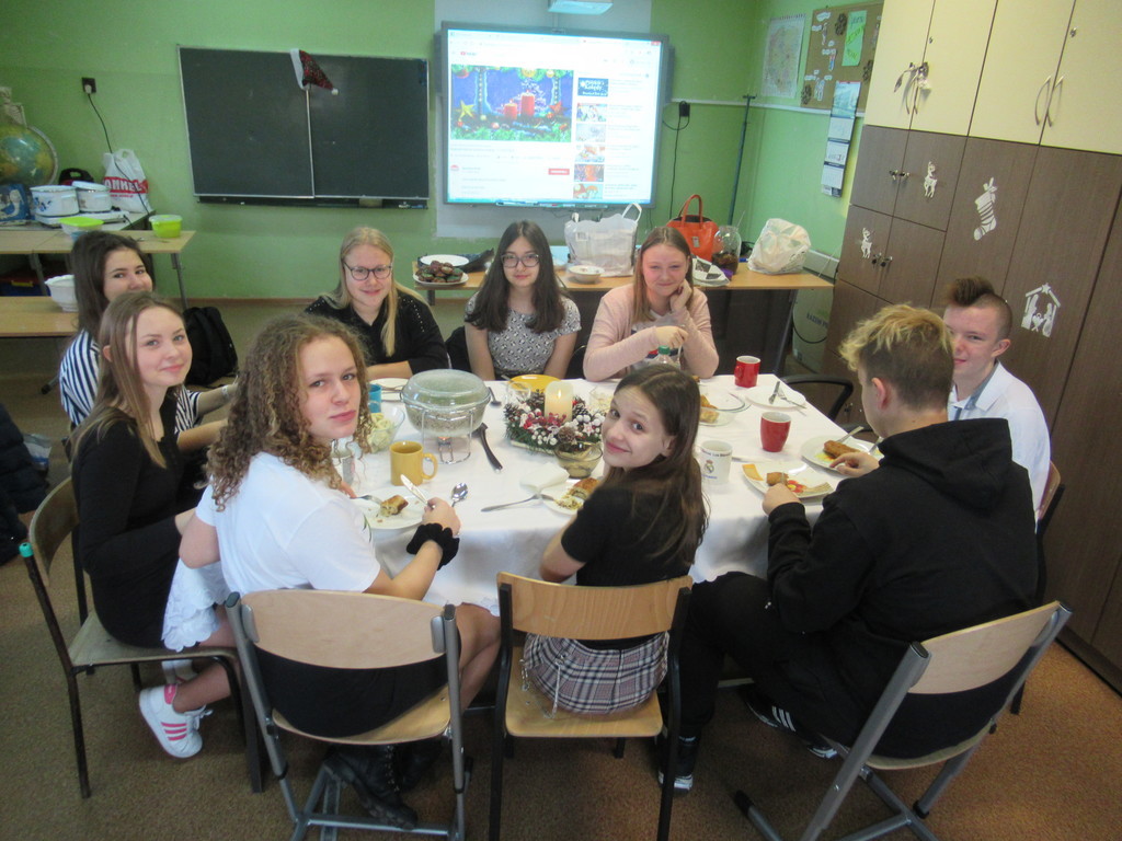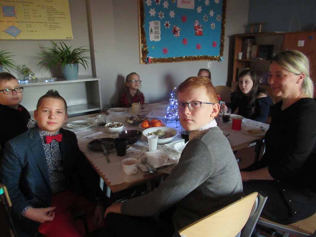 Dzisiejszy dzień w szkole, to dzień wigilii klasowych. Każda klasa zasiadła do stołu zastawionego, bardziej lub mniej obficie, w tradycyjne potrawy. Rozmowa przy choince o tradycjach wigilijnych bardzo zainteresowała uczniów. Były to bardzo miło spędzone chwile.