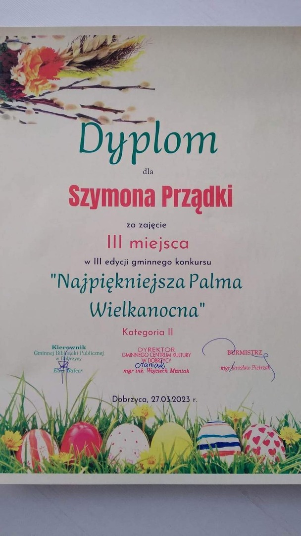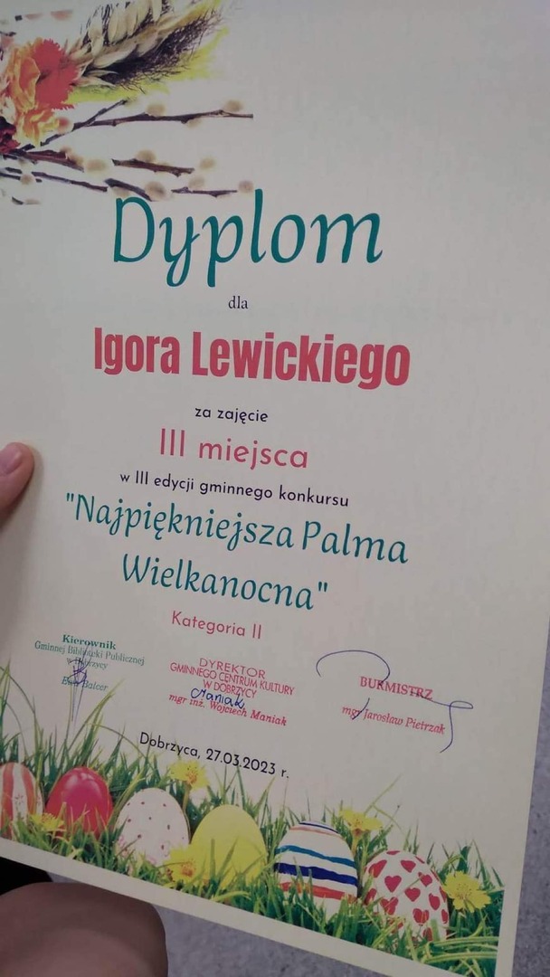 Szymon Prządka z klasy IV i Igor Lewicki z klasy V wzięli udział w III edycji konkursu na „Najpiękniejszą Palmę Wielkanocną” organizowanego przez Gminne Centrum Kultury w Dobrzycy.