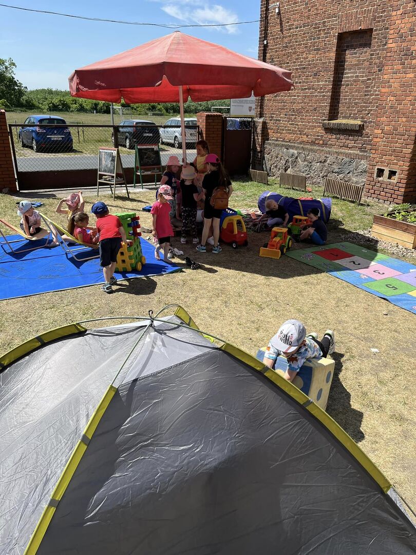 Przedszkolaki i klasy 1-3 spędziły czas na boisku szkolnym bawiąc się. Kiełbasa z grilla, lody