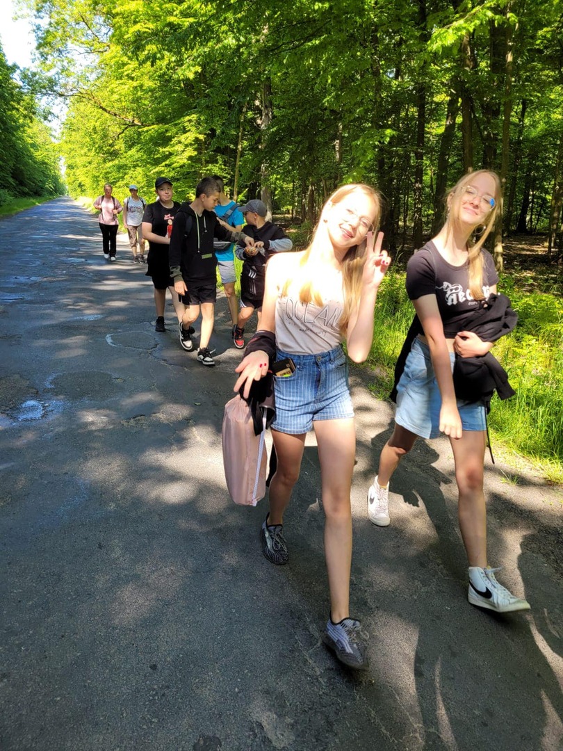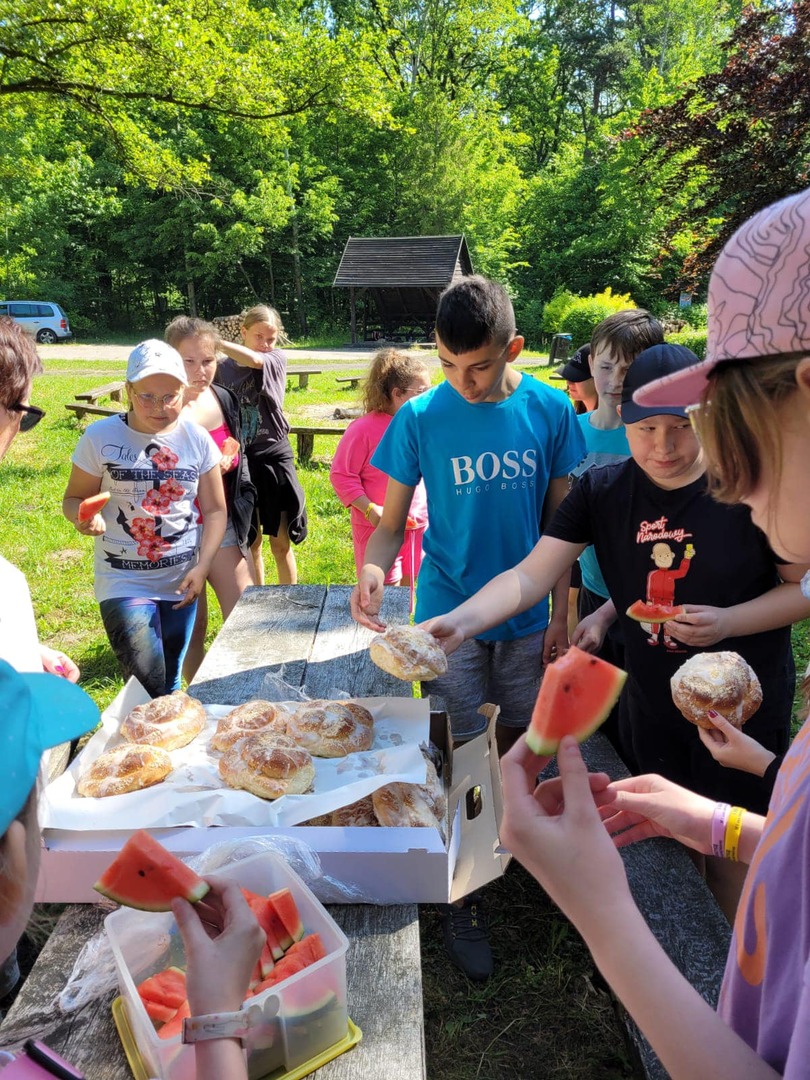 i inne słodkości umiliły im czas. Równolegle uczniowie z klas 4-8 wyruszyli na krótki rajd pieszy do pobliskiego lasu. Tam odpoczynek i powrót z piosenką na ustach. Rada rodziców przygotowała dla wszystkich słodkie paczuszki