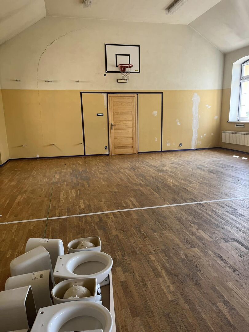 Nowe drzwi do szatni przy sali gimnastycznej - drewniane, masywne, z magicz...eee magnetycznymi zamkami. Sala gimnastyczna pomalowana, jasna i czysta do pierwszej lekcji wuefu