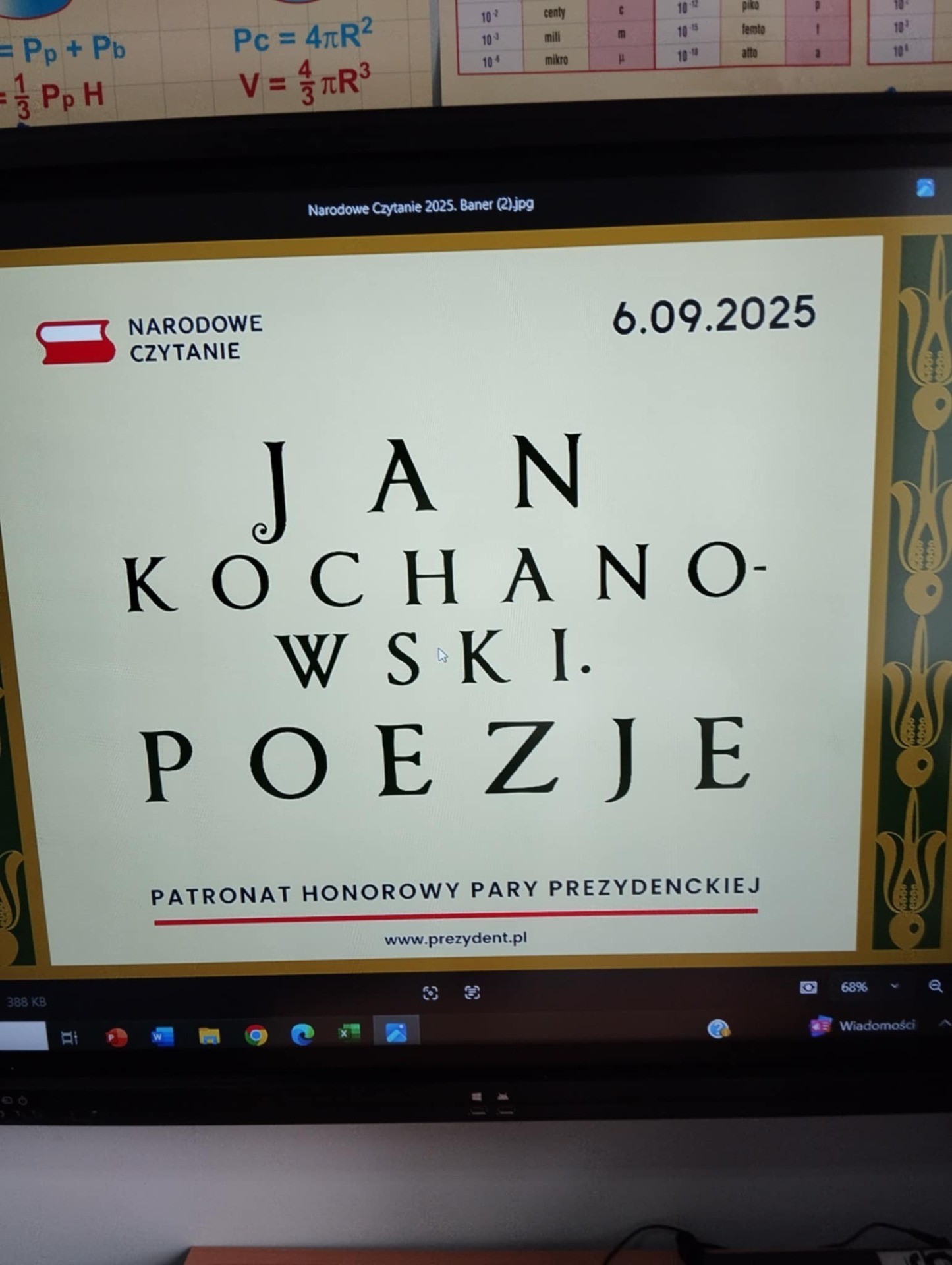 Jak co roku nasza szkoła przyłączyła sie do ogólnopolskiej akcji społecznej "Narodowe Czytanie", której ideą jest propagowanie polskiej literatury i wzmacnianie tożsamości narodowej. Akcja organizowana jest przez Prezydenta RP od 2012r. W tym roku lekturą Narodowego Czytania jest poezja Jana Kochanowskiego, w której głęboka zaduma nad swiatem łączy się z humorem, a idee humanizmu z dojrzała refleksją obywatelską i troską o losy Ojczyzny.