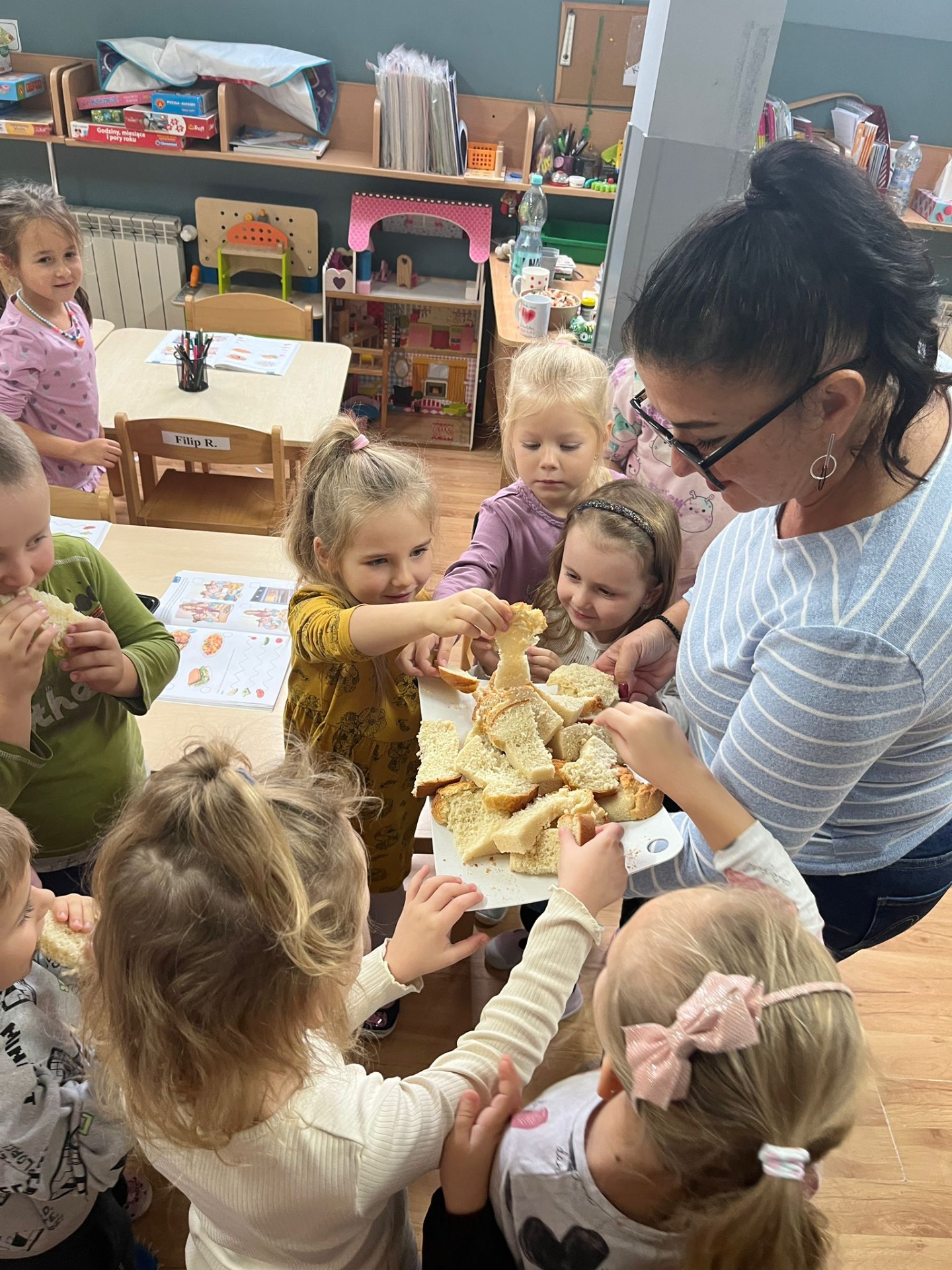 Na koniec nie zabrakło degustacji – przedszkolaki z apetytem próbowały różnych rodzajów pieczywa, doceniając smak zdrowych produktów!