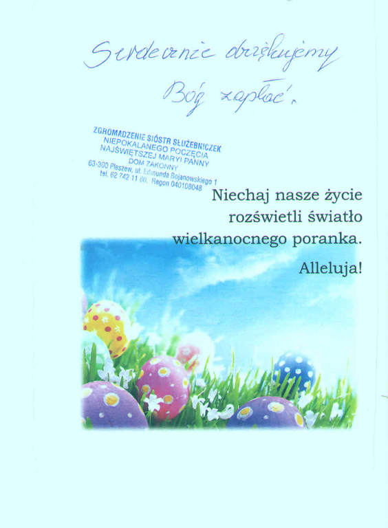 Zgromadzenie Sióstr Służebniczek w Pleszewie serdecznie dziękuję za wszystkie dary przekazane dla potrzebujących.